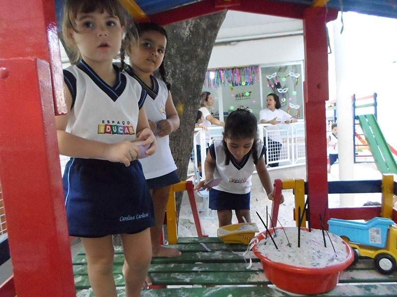 Nessas atividades, as crianças ampliam as noções de ordem para entrar no parque, brincam de fazer bolo de areia, participam de jogos simbólicos por meio das brincadeiras de faz de conta, trocam experiências ricas tanto para o conhecimento de mundo como para formação pessoal e social.
