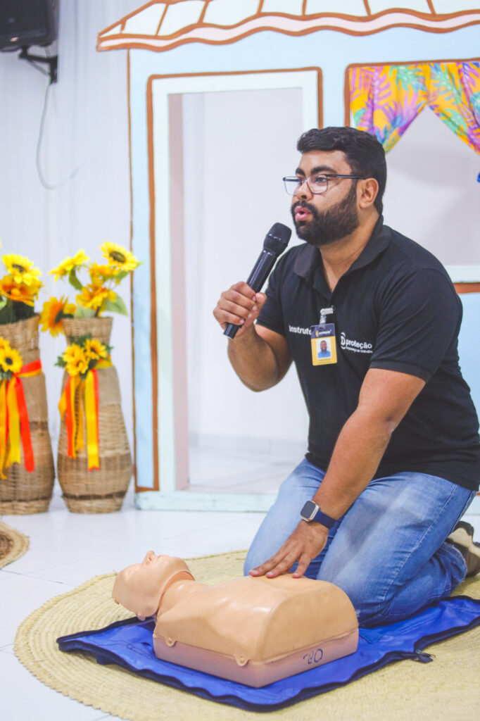 Além das técnicas de combate a incêndio, o treinamento incluiu uma seção detalhada sobre primeiros socorros. Os colaboradores aprenderam a realizar massagem cardíaca, conhecida como RCP (ressuscitação cardiopulmonar), e técnicas para lidar com situações de engasgo, desmaios e ferimentos. Cada técnica foi demonstrada passo a passo, permitindo que os participantes praticassem e também tirassem dúvidas em tempo real.